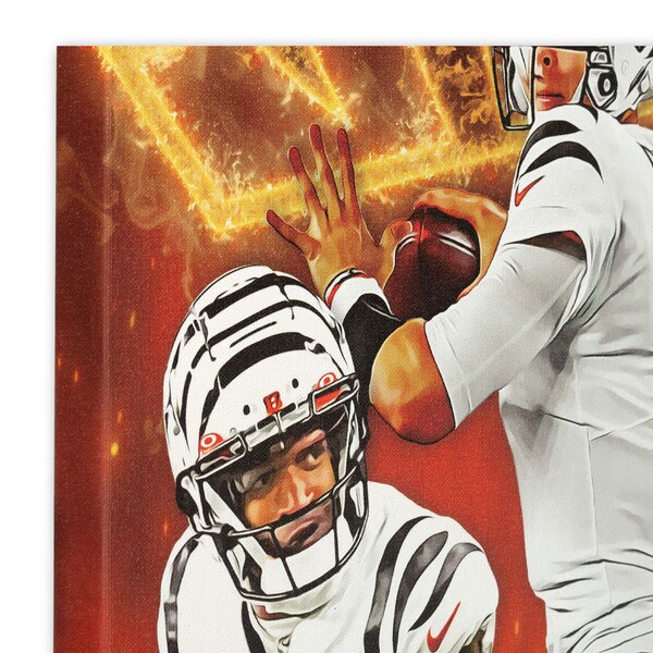 Honor the incomparable Cincinnati Bengals with this visually stunning and action-packed wall decor! Featuring the dynamic quarterback Joe Burrow and the incredible wide receiver Ja'Marr Chase in action, this artwork captures all the skill and intensity that define these players and the team as a whole.