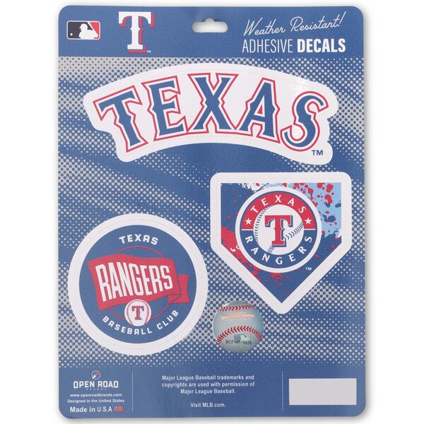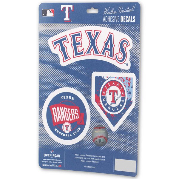 Bring the excitement of Texas Rangers baseball home with this vibrant collection of three decals. This set of three decals brings bold colors and dynamic energy to any surface, making your team pride impossible to miss.