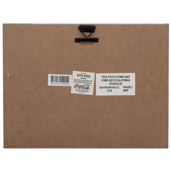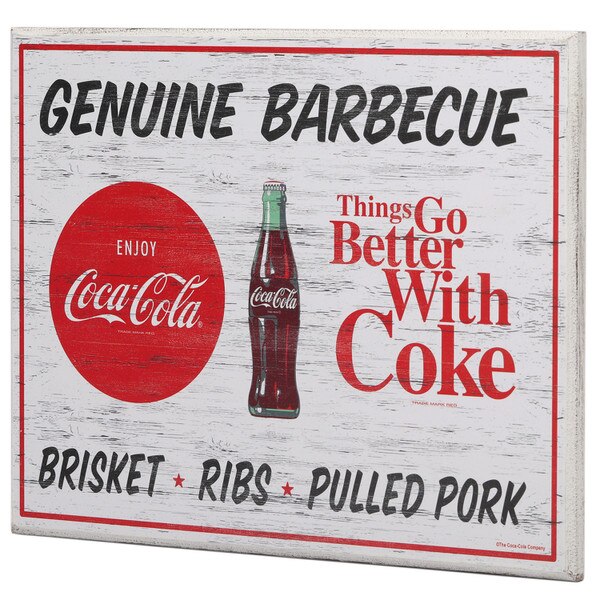 Things go better with Coke! This old-fashioned wall decor boasts classic Coca-Cola logos and illustrations alongside barbecue-inspired text.